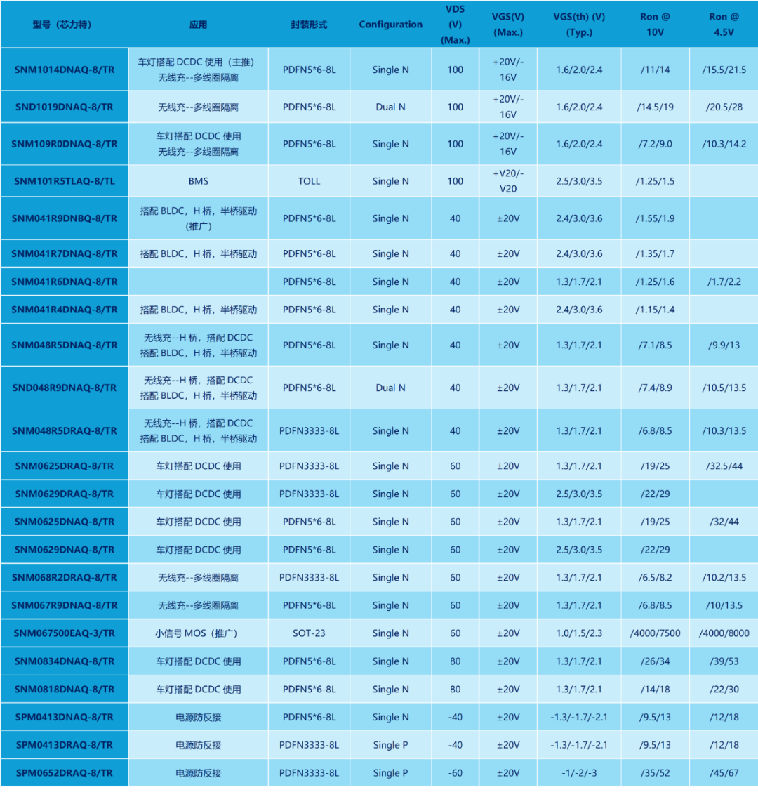 芯力特新推出的车规级MOSFET产品,满足AECQ101标准,提供了N40V,N60V,N80V,N100V,P40V,P60V等系列产品。该系列产品采用了先进的沟槽技术设计,与传统标准沟槽设计相比,具备更低的FOM值,同性能下具有更小的die size和更优的开关性能,拥有更好的性价比。该系列产品采用了Clip Bond封装,可靠性优于多数国内品牌采用的Wire Bond封装,因为Wire Bond封装容易在大规模量产中产生弹坑等品质问题。