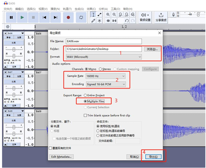 按如下配置导出为wav文件: