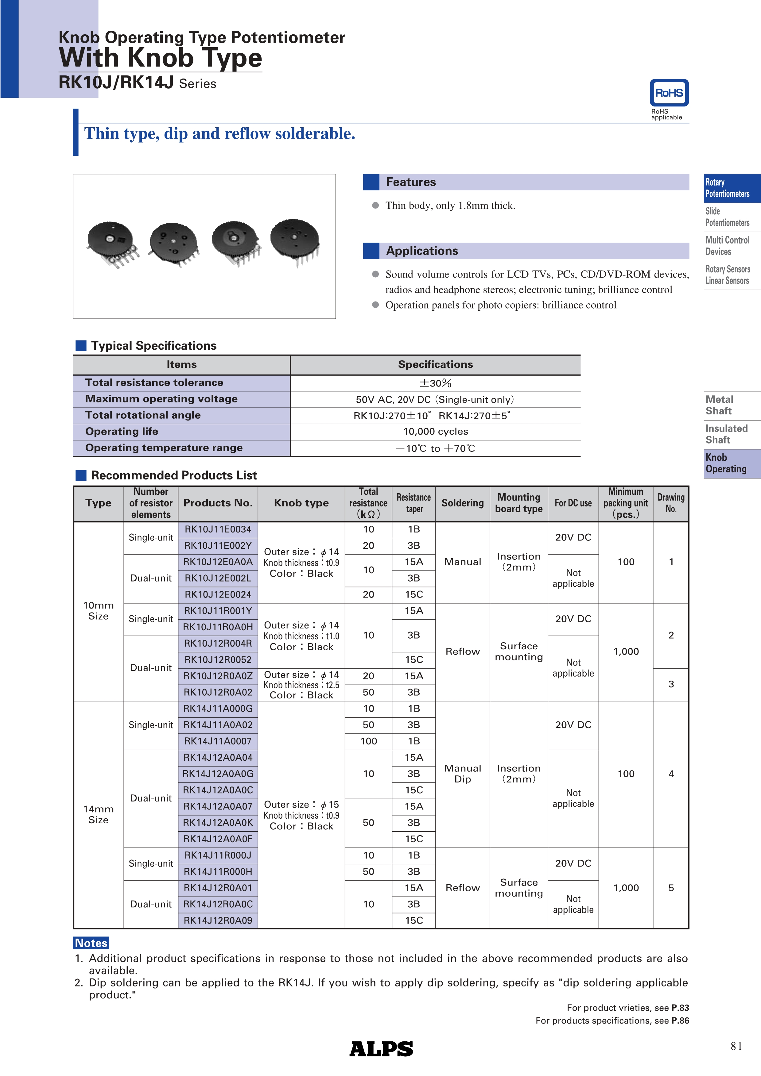 ALPS旋转电位器RK10J / RK14J系列