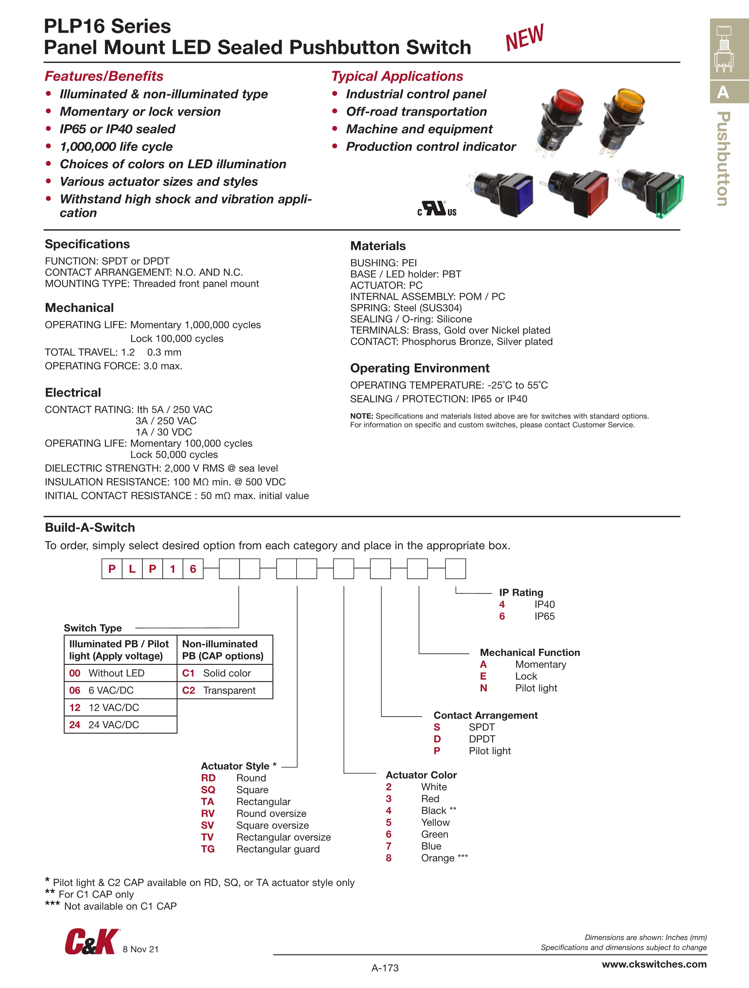 C&K按动开关PLP16系列