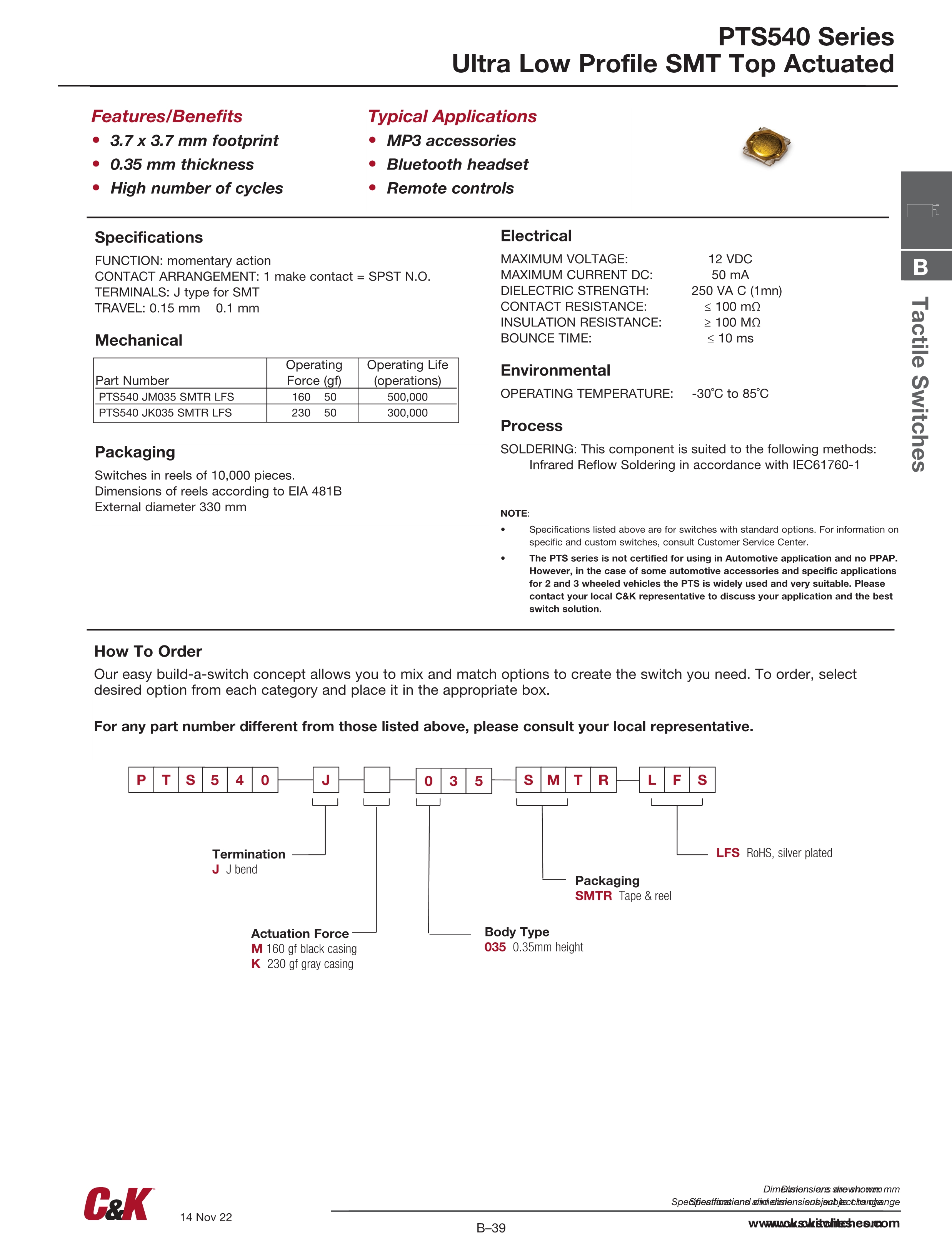 C&K轻触开关PTS540系列