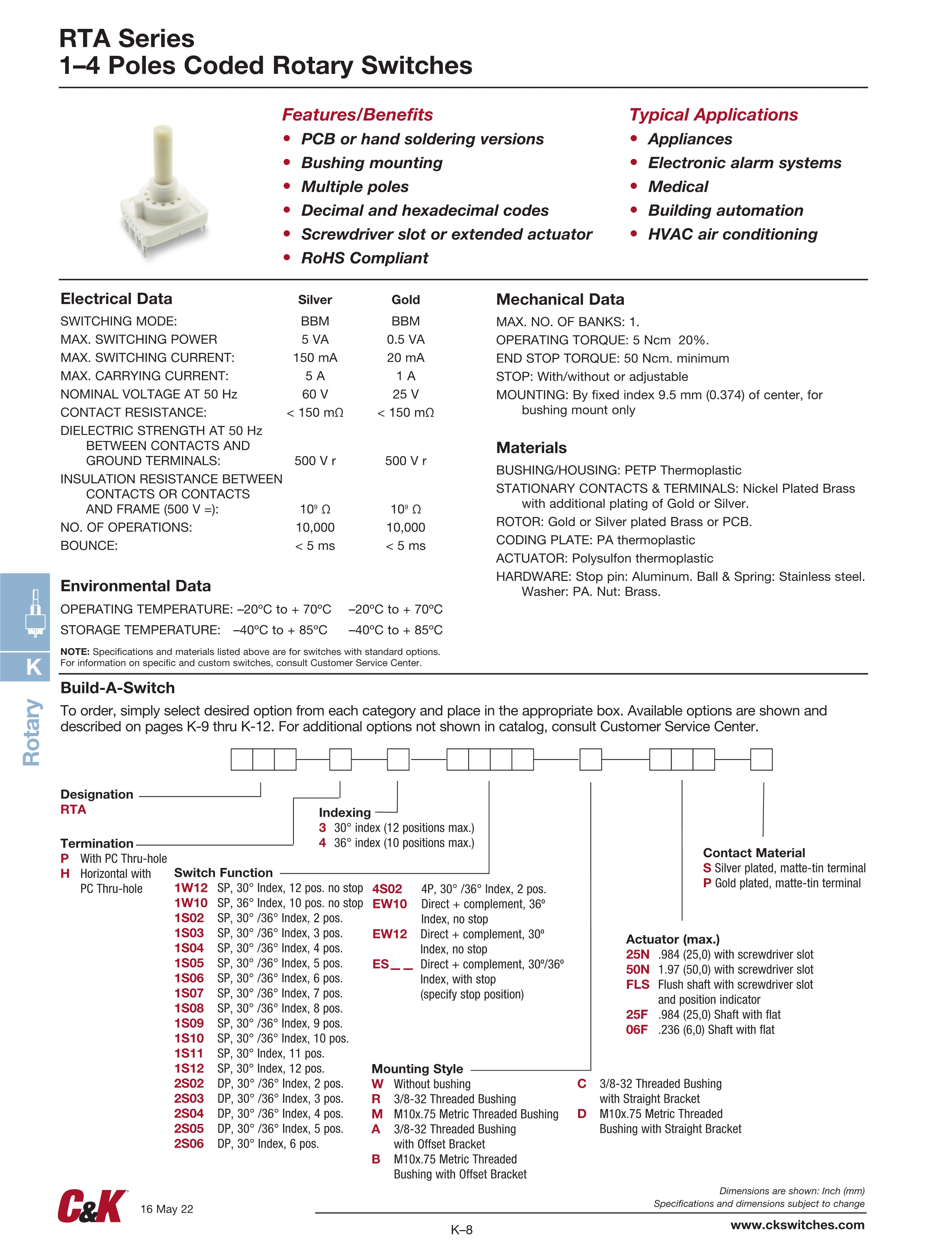 C&K旋转开关RTA系列