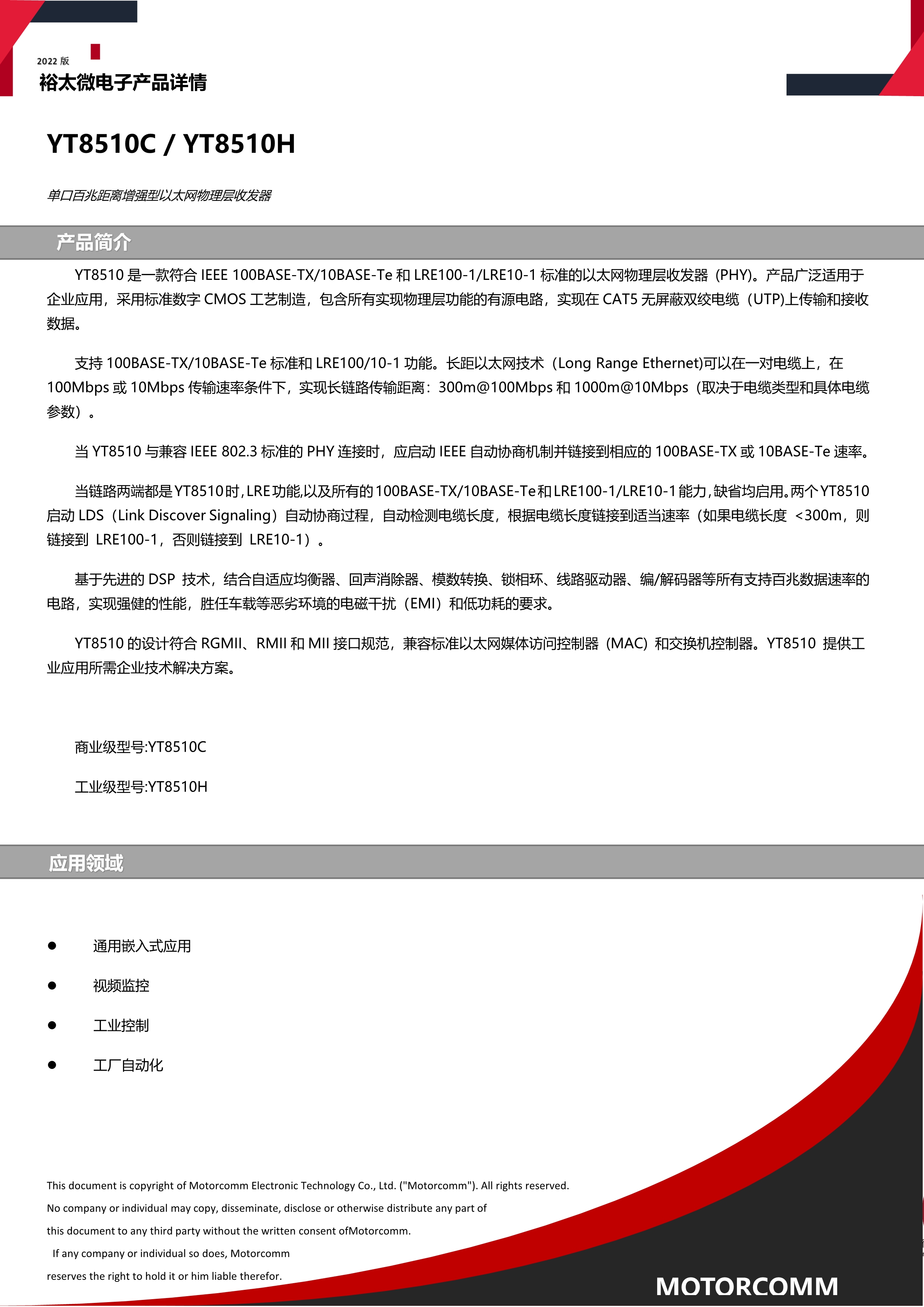 裕太微以太网物理层芯片YT8510C_YT8510H系列