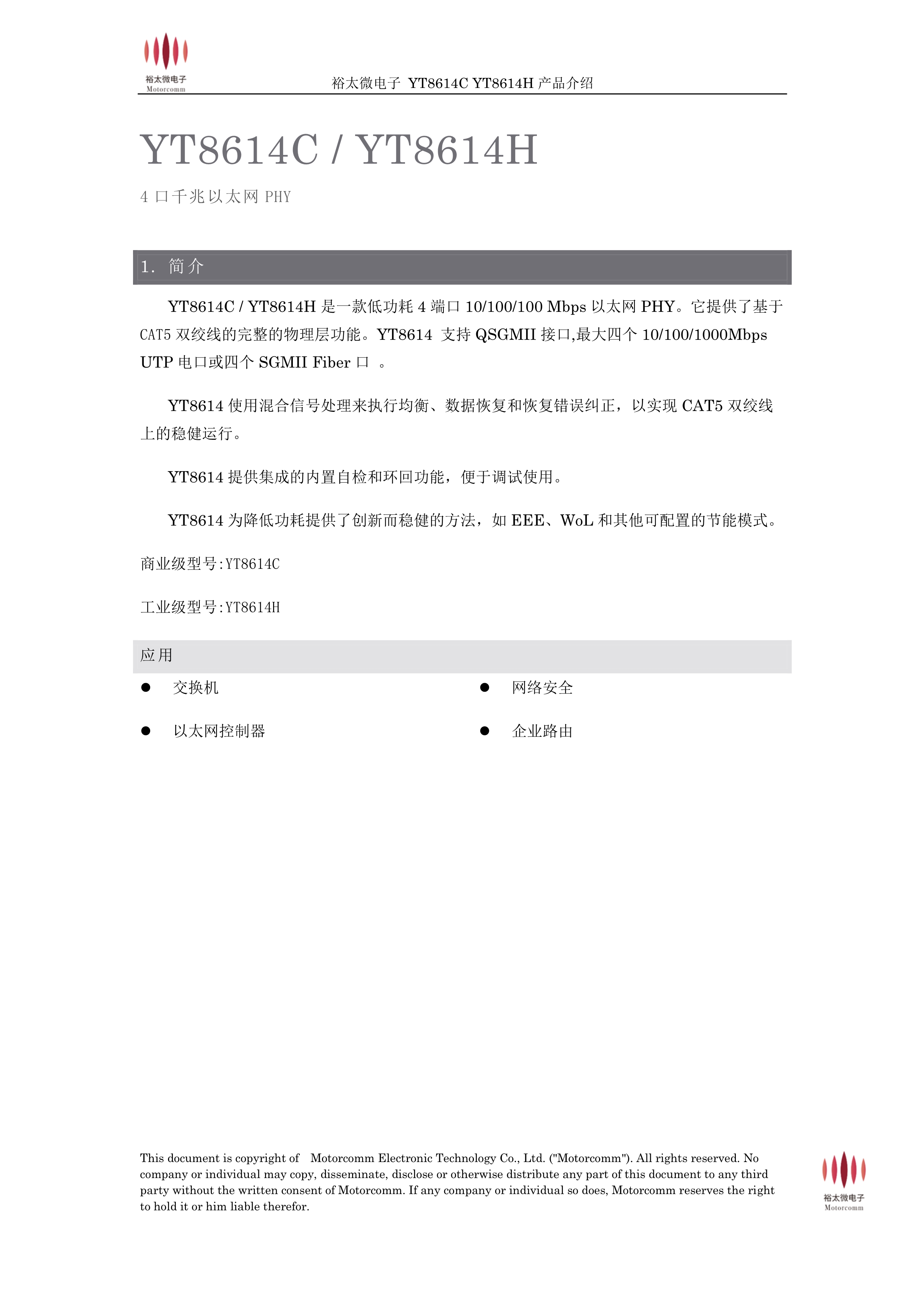 裕太微以太网物理层芯片YT8614C_YT8614H系列