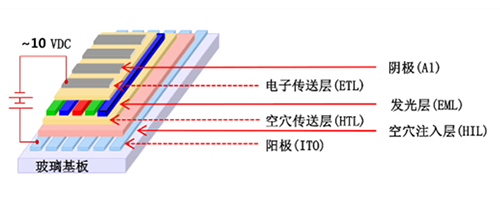电流在多层有机混合物薄膜流通,使电子和空穴在发光层结合,从而发生特定的光