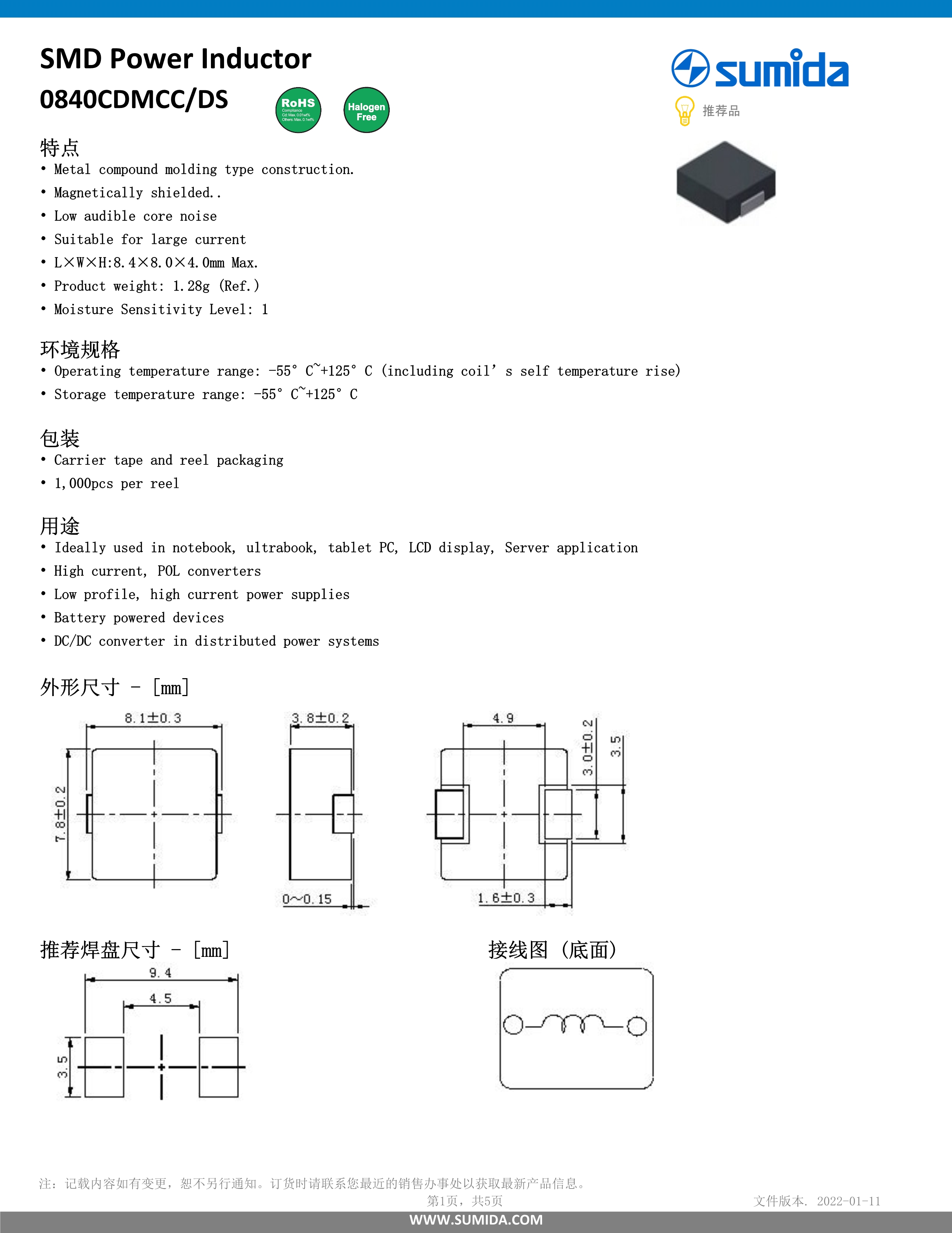 胜美达薄型大电流电感器0840CDMCCDS系列