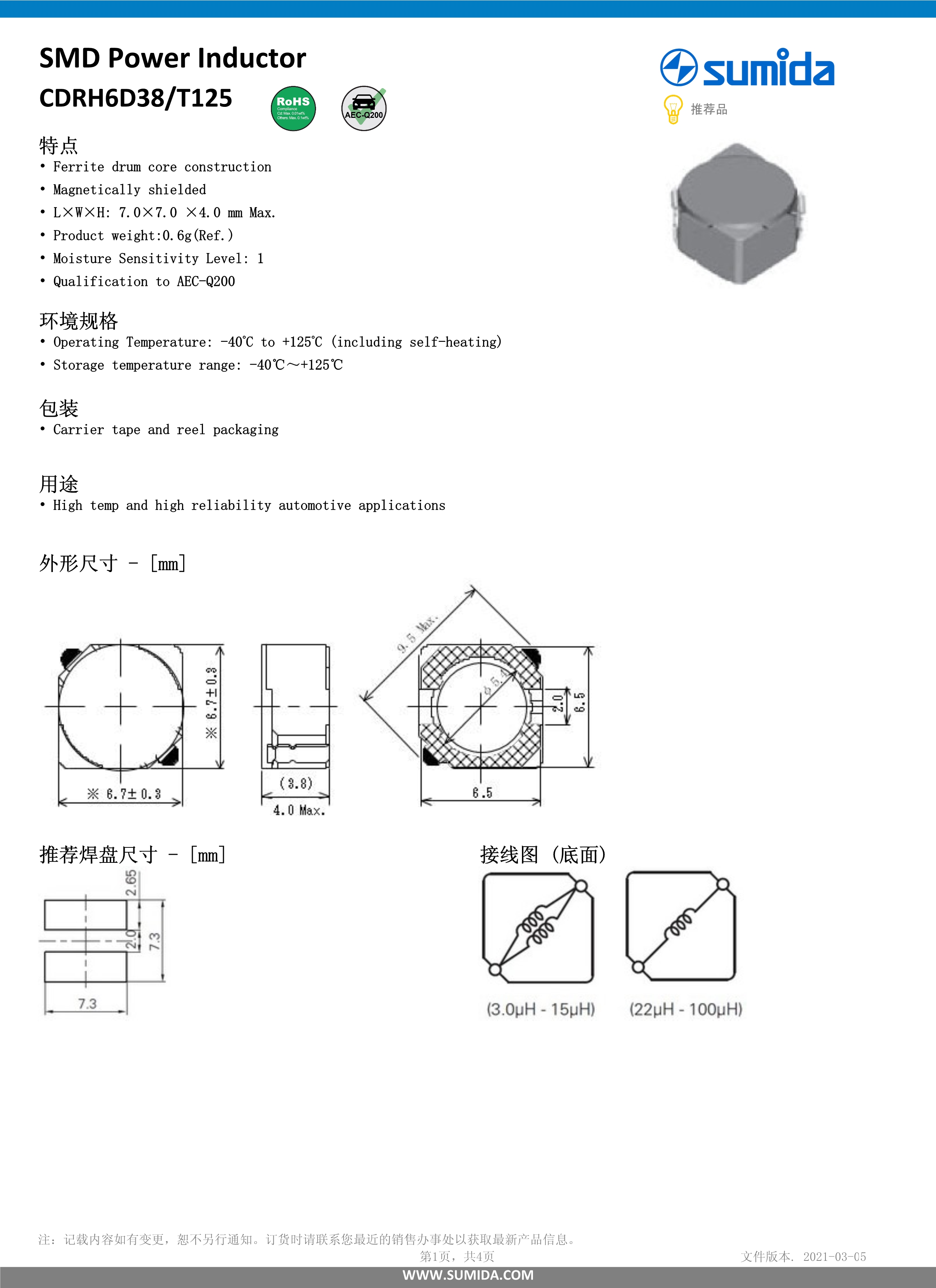 胜美达车载用电感器CDRH6D38T125系列