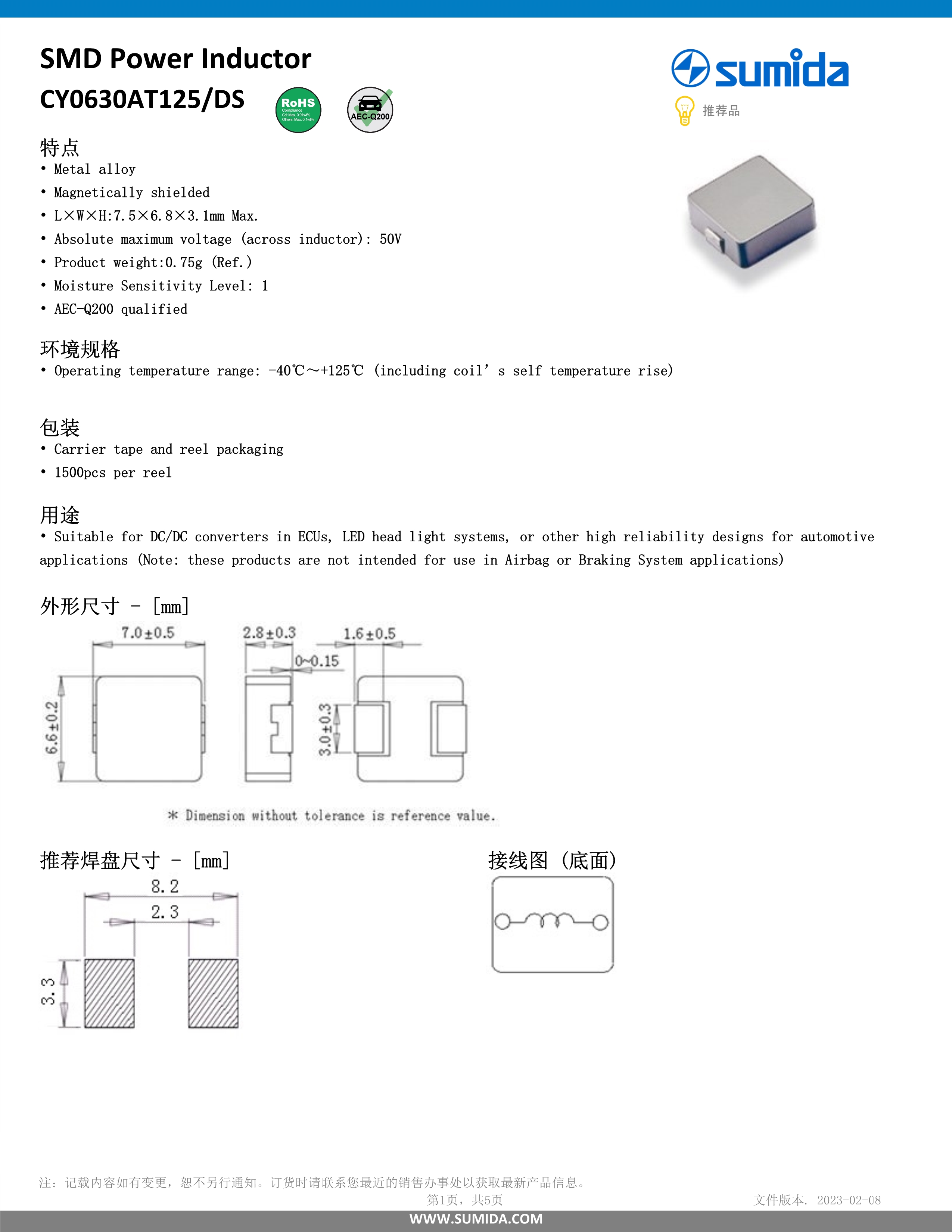 胜美达车载用电感器CY0630AT125DS系列