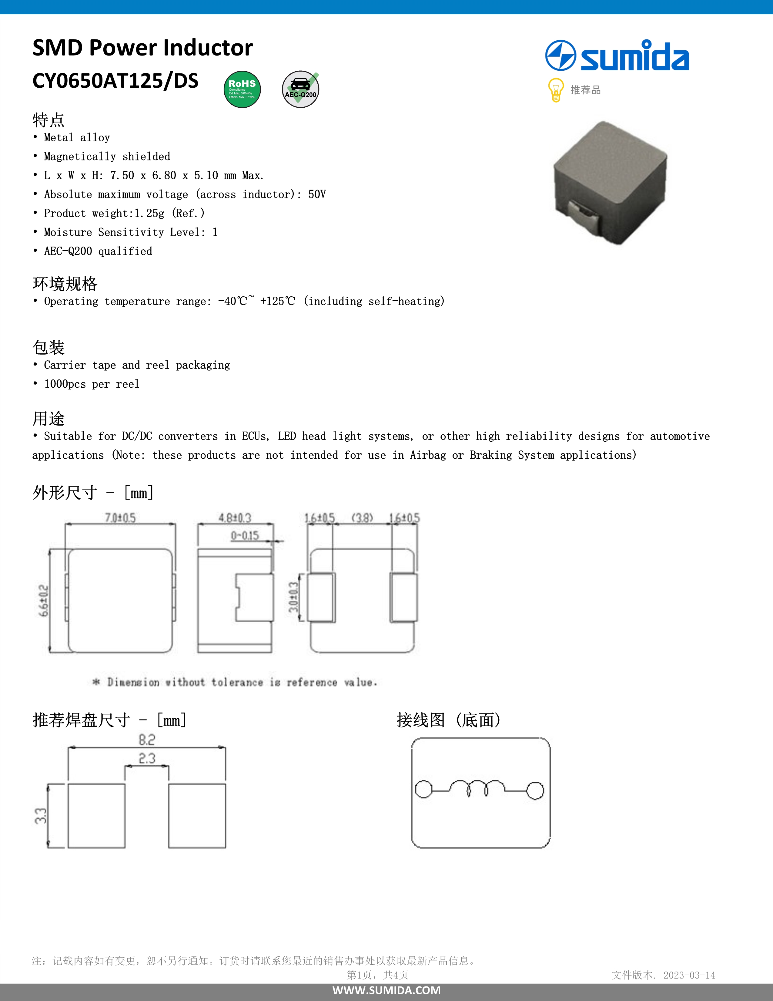 胜美达车载用电感器CY0650AT125DS系列