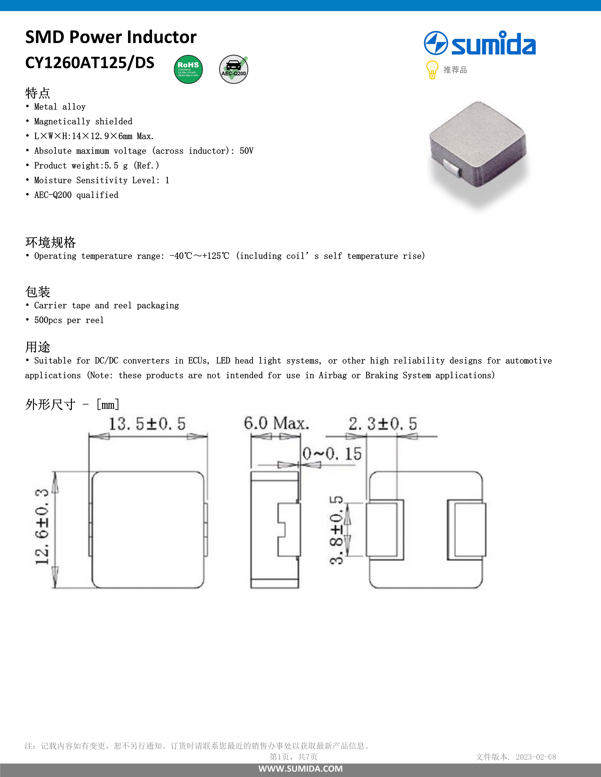 胜美达车载用电感器CY1260AT125DS系列