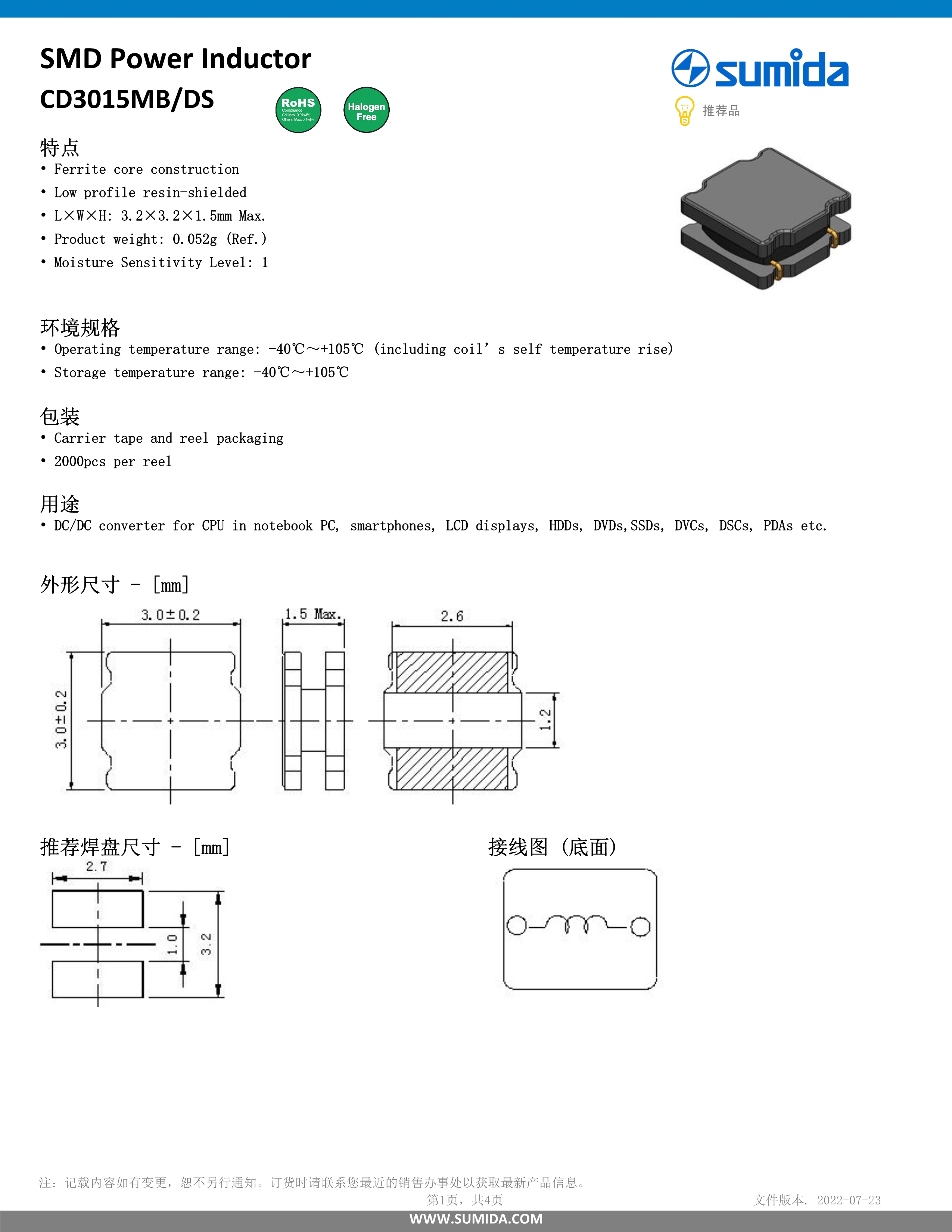 胜美达一般电感器CD3015MBDS系列